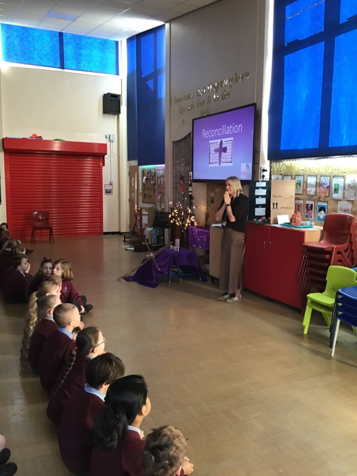 During Lent, we allow the children to experience a Reconciliation service to show penance for any wrong doings. The children in KS2 took part in the service led by Mrs Wolstenholme and were all very respectful and prayerful as we said sorry to God for our sins. The children also had some quiet reflection time to have their own conversation with God about what they would like to say sorry for and if they need to seek forgiveness.