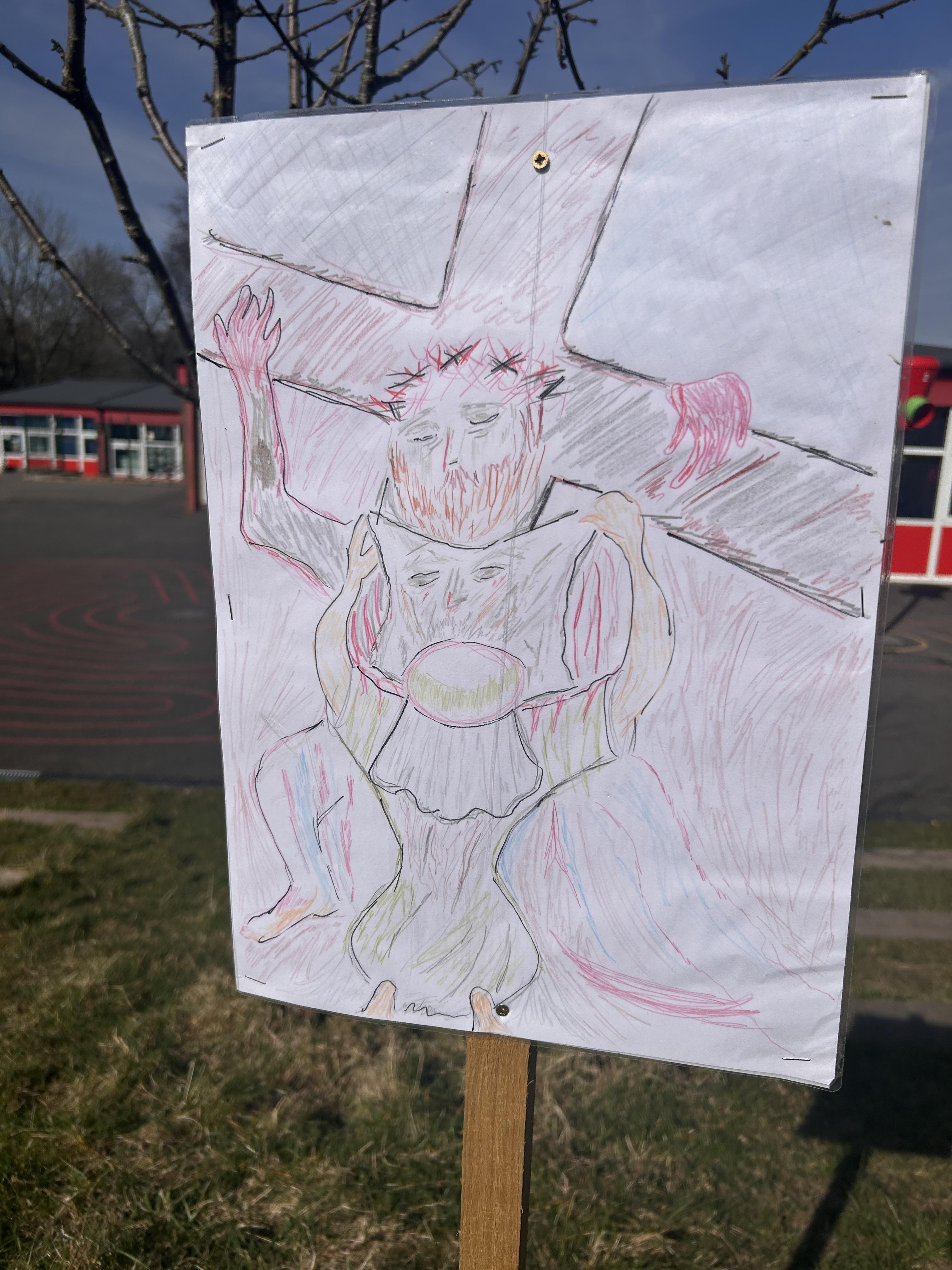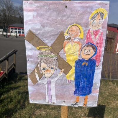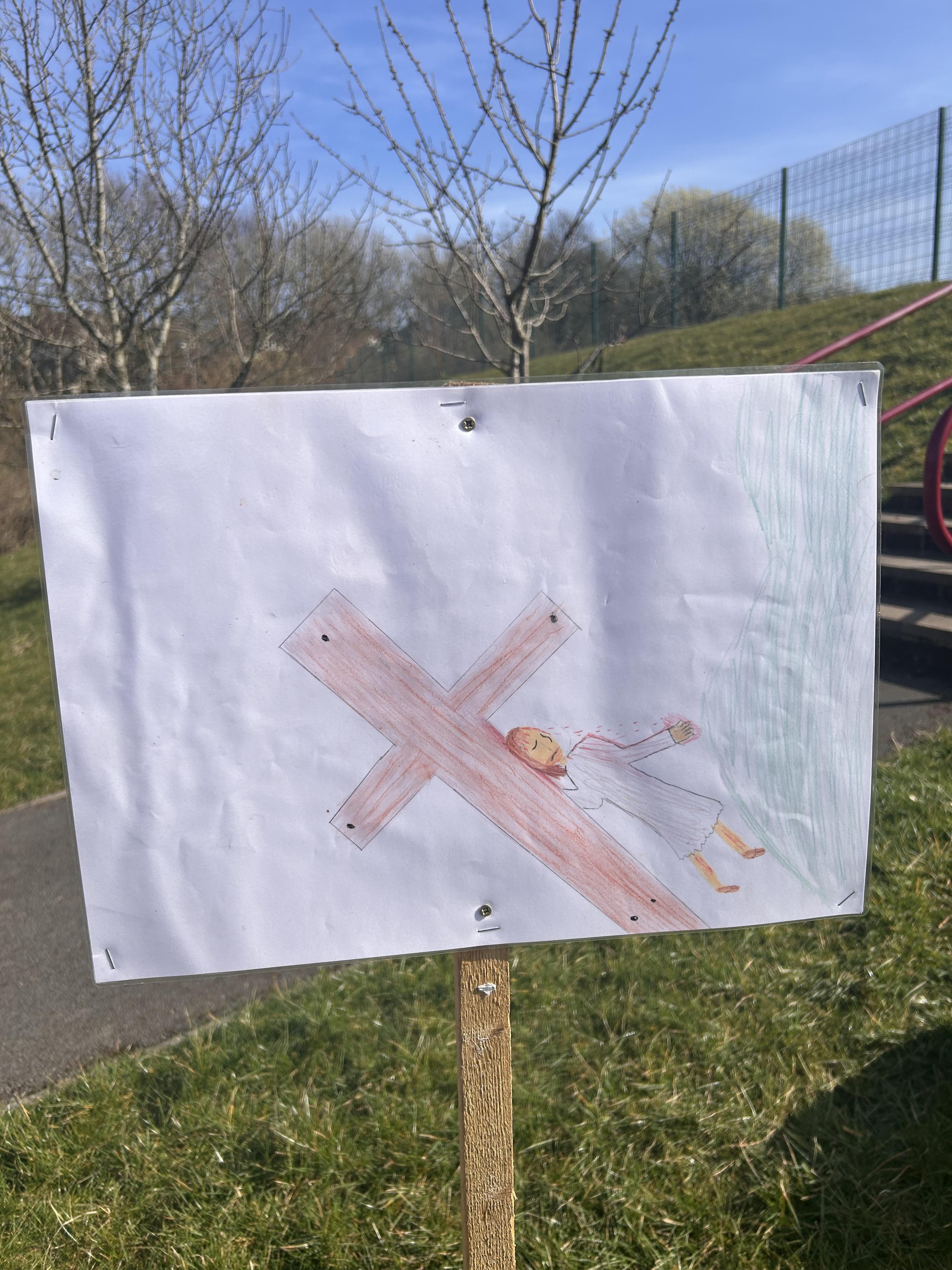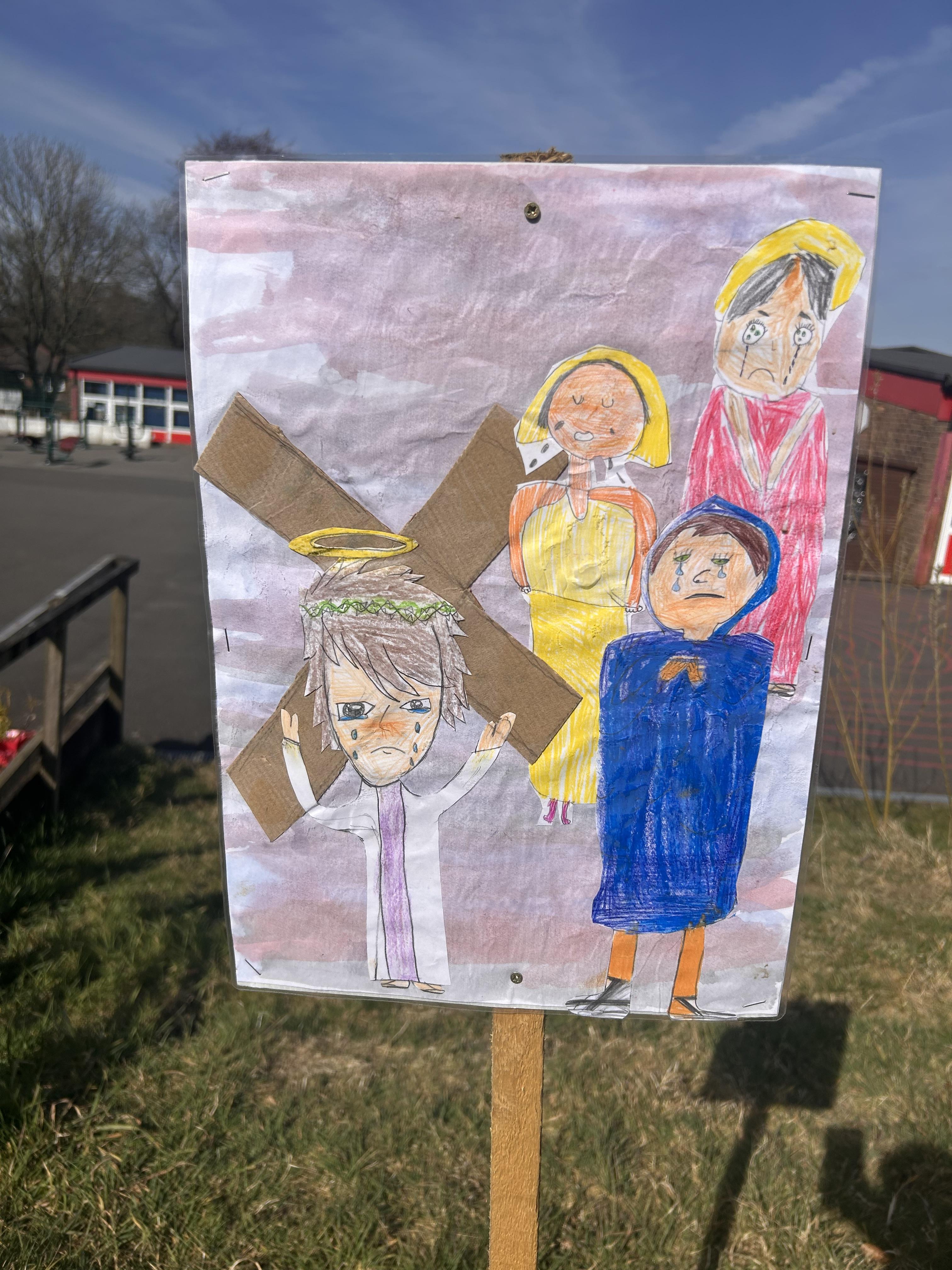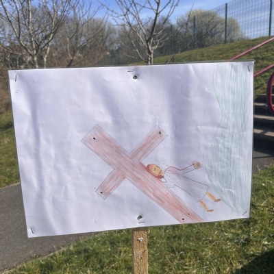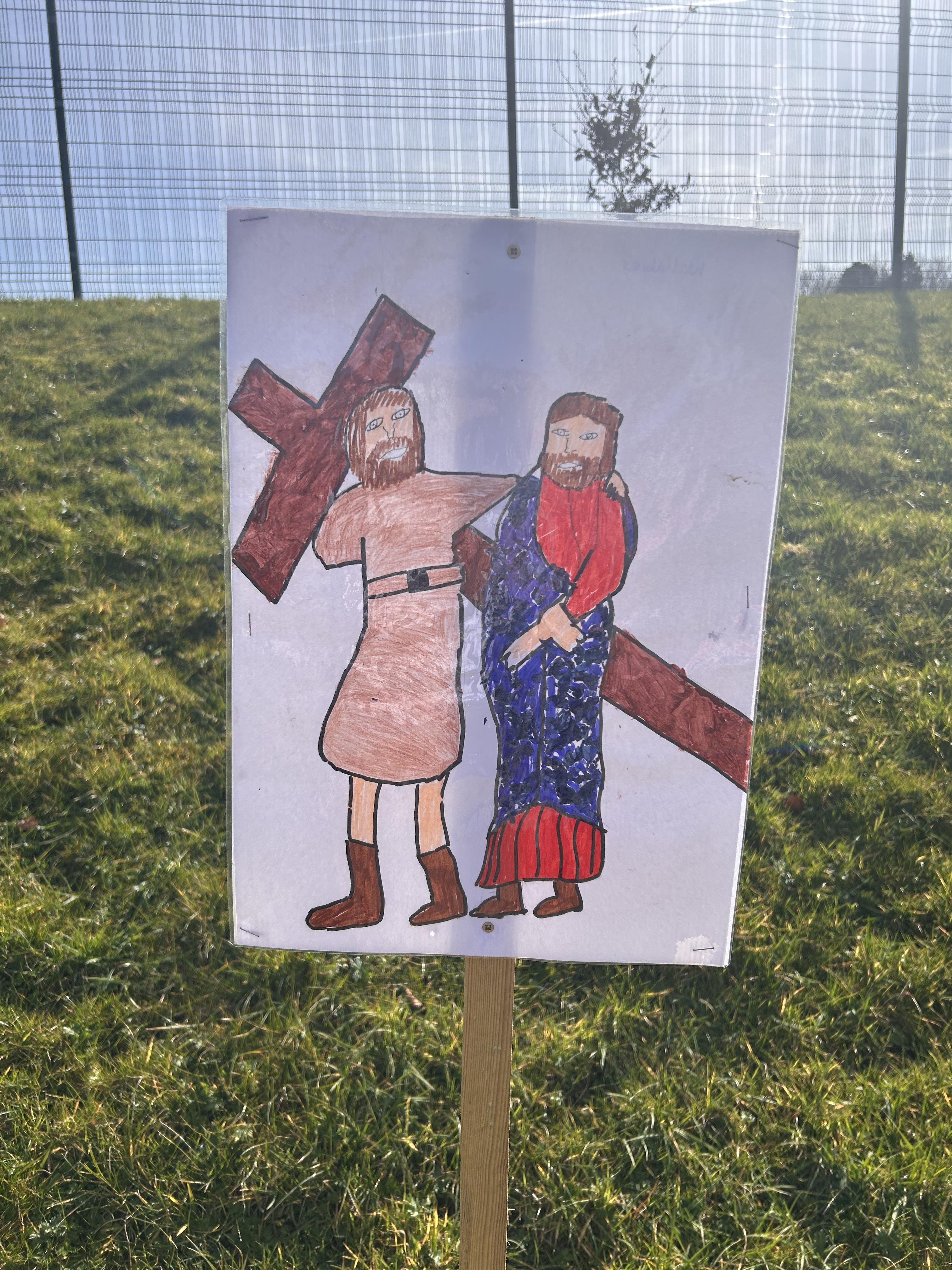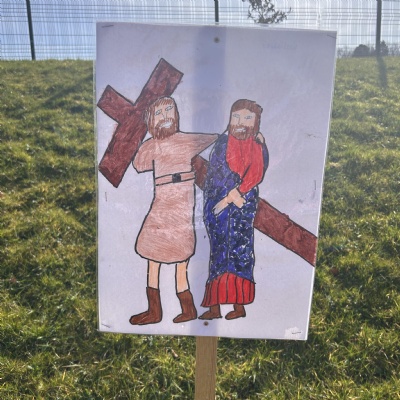 During Lent, pupils crated images of a stations of the cross. These were then enlarged, laminated and put around the sensory path on the playground. During Holy Week, classes went out to pray the Stations.