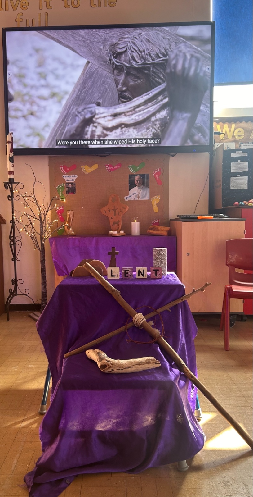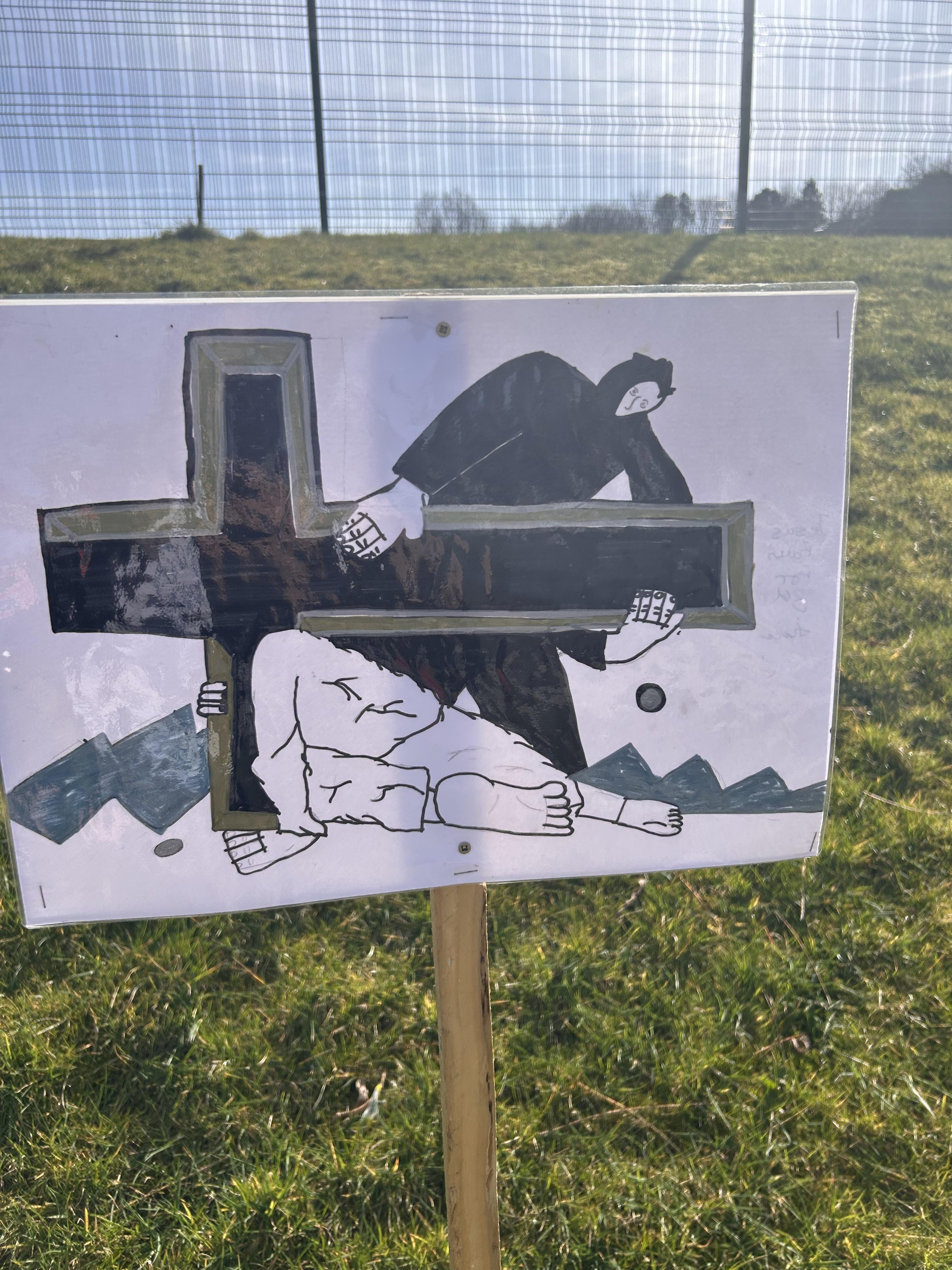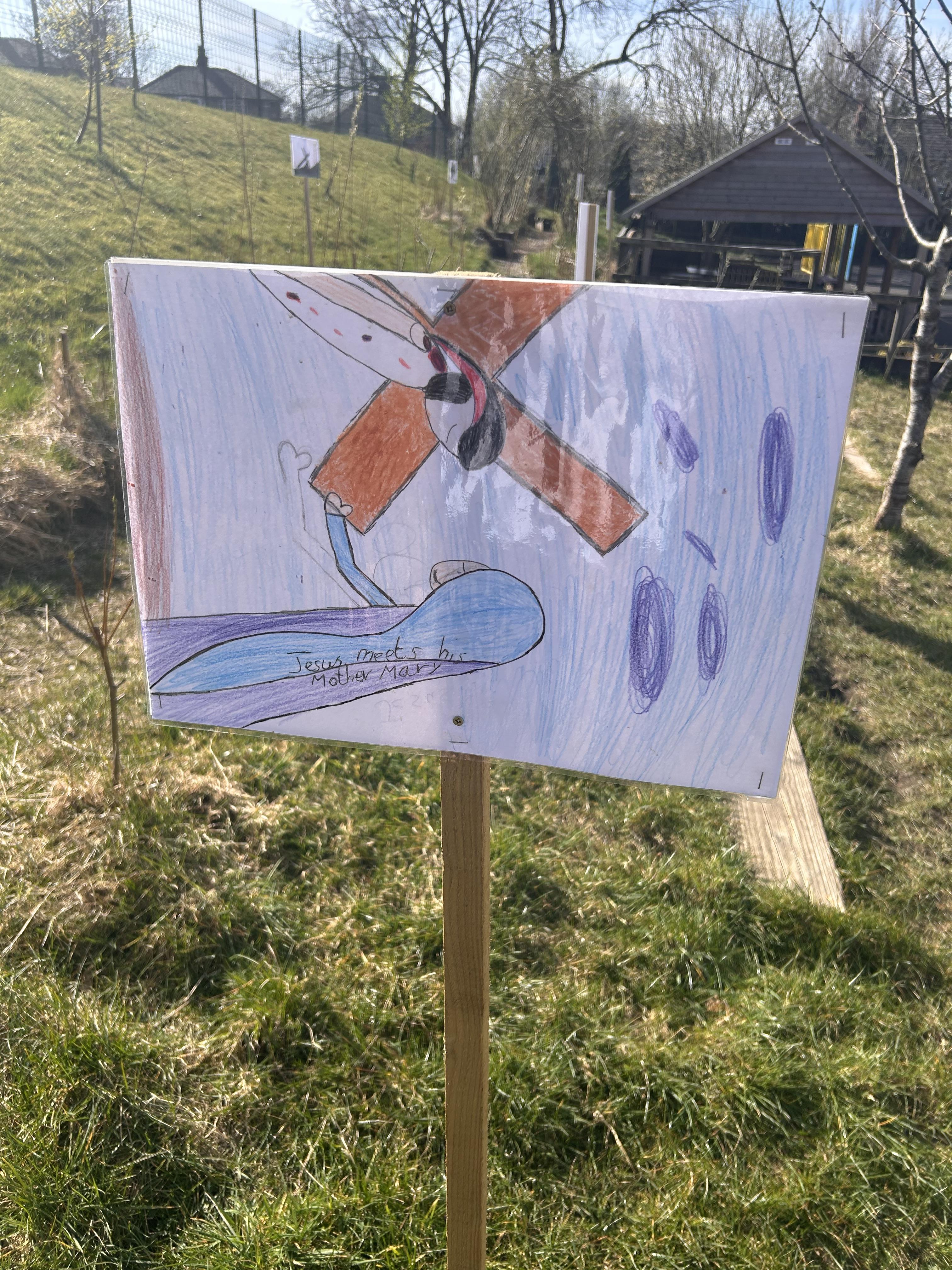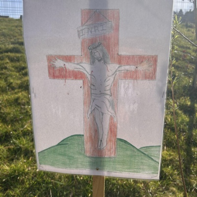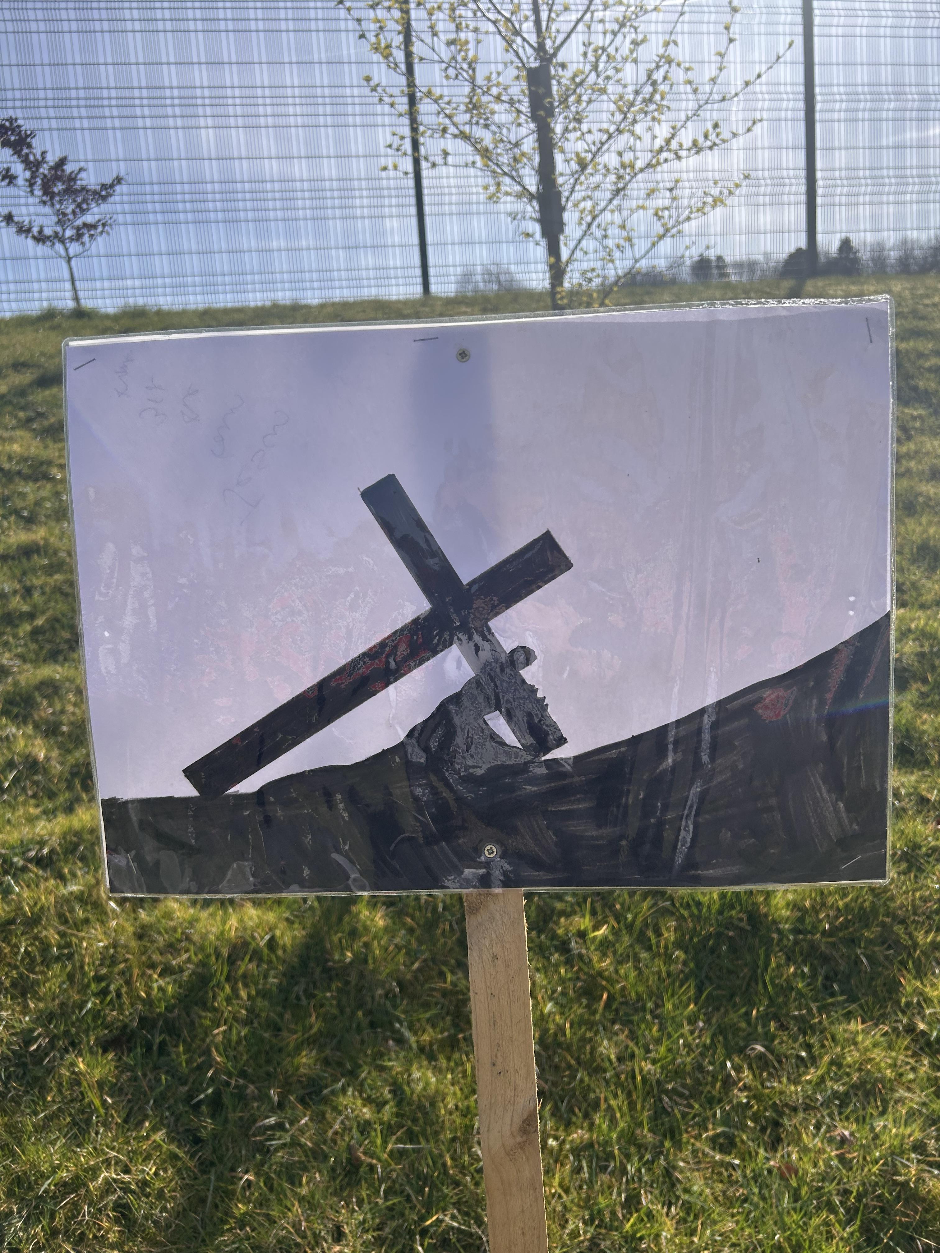 During Lent, pupils crated images of a stations of the cross. These were then enlarged, laminated and put around the sensory path on the playground. During Holy Week, classes went out to pray the Stations.
