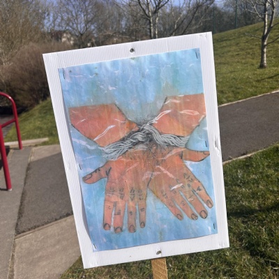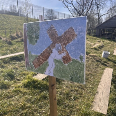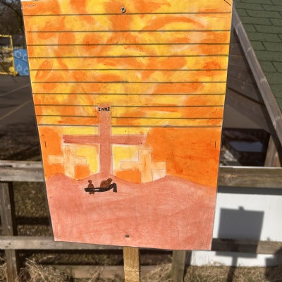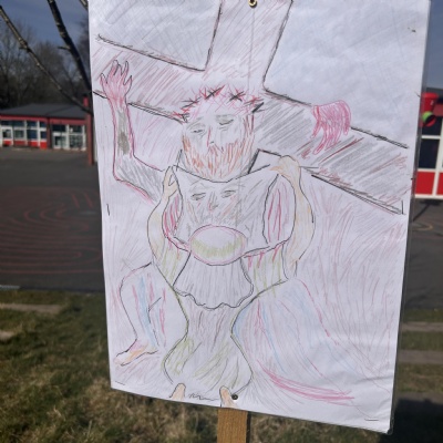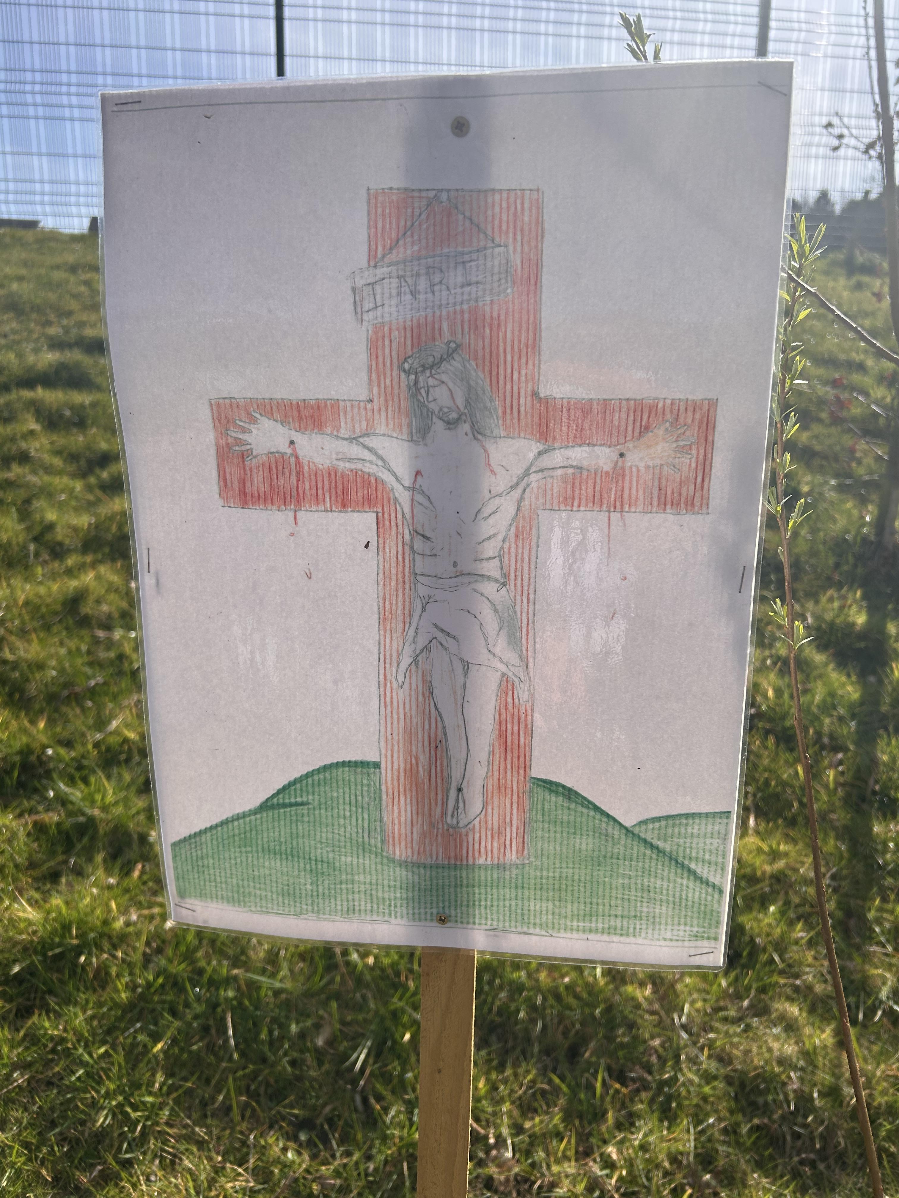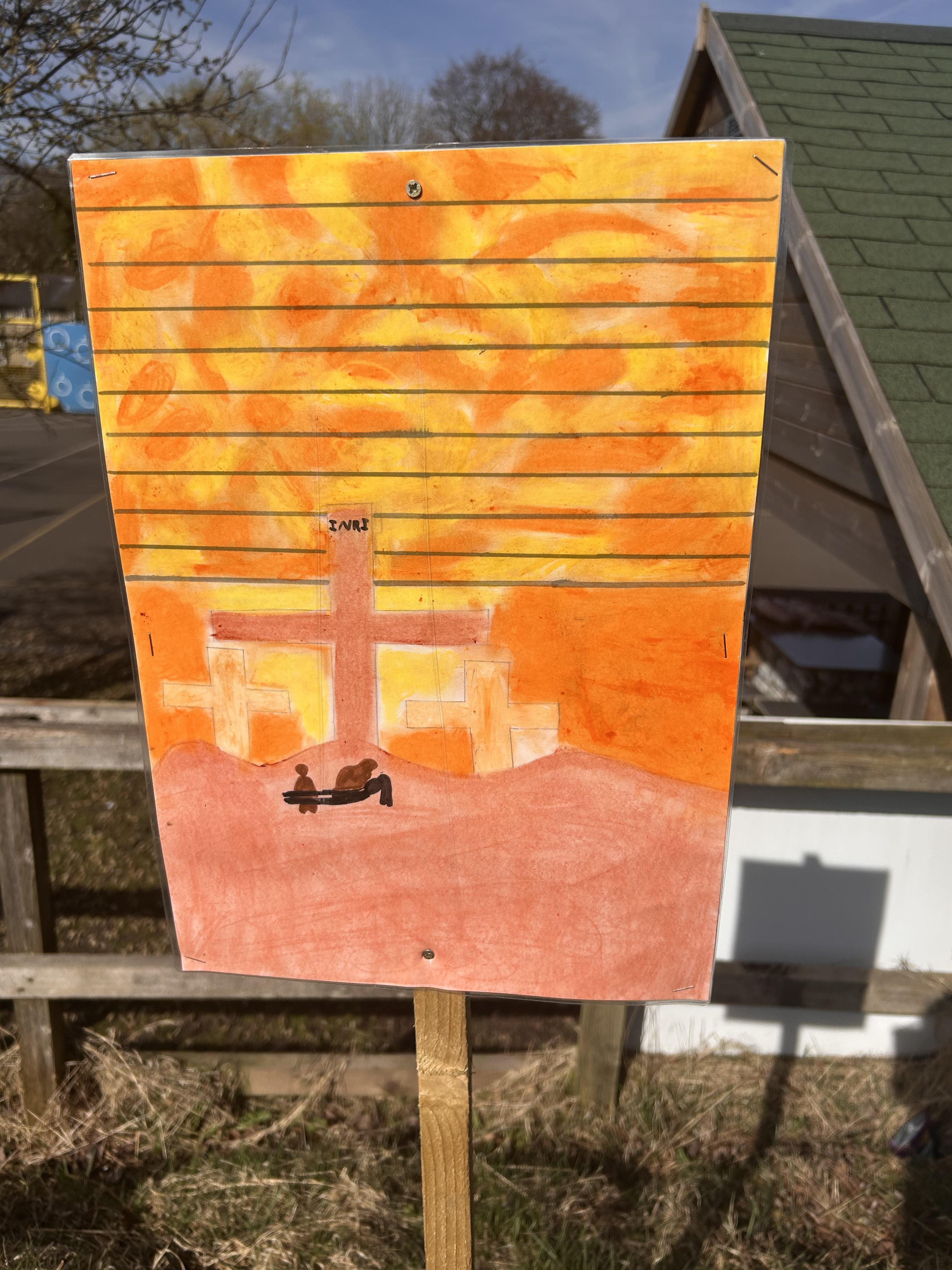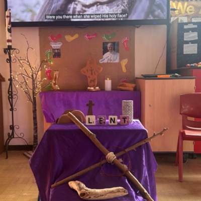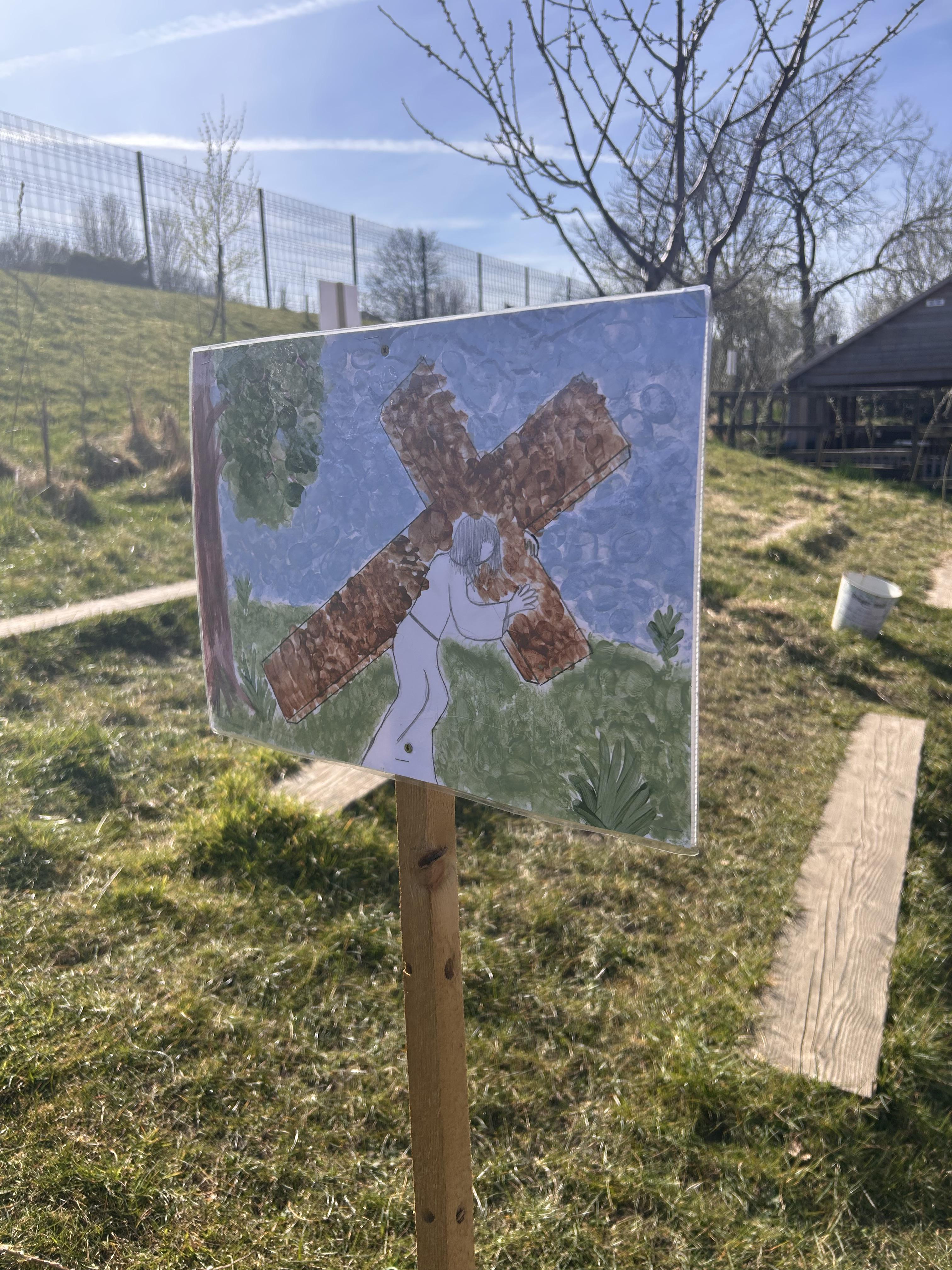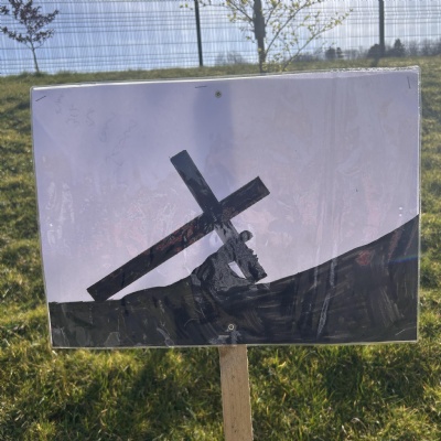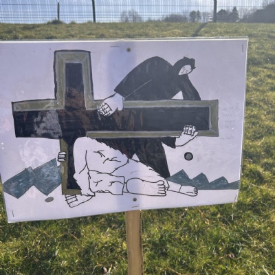 During Lent, pupils crated images of a stations of the cross. These were then enlarged, laminated and put around the sensory path on the playground. During Holy Week, classes went out to pray the Stations.