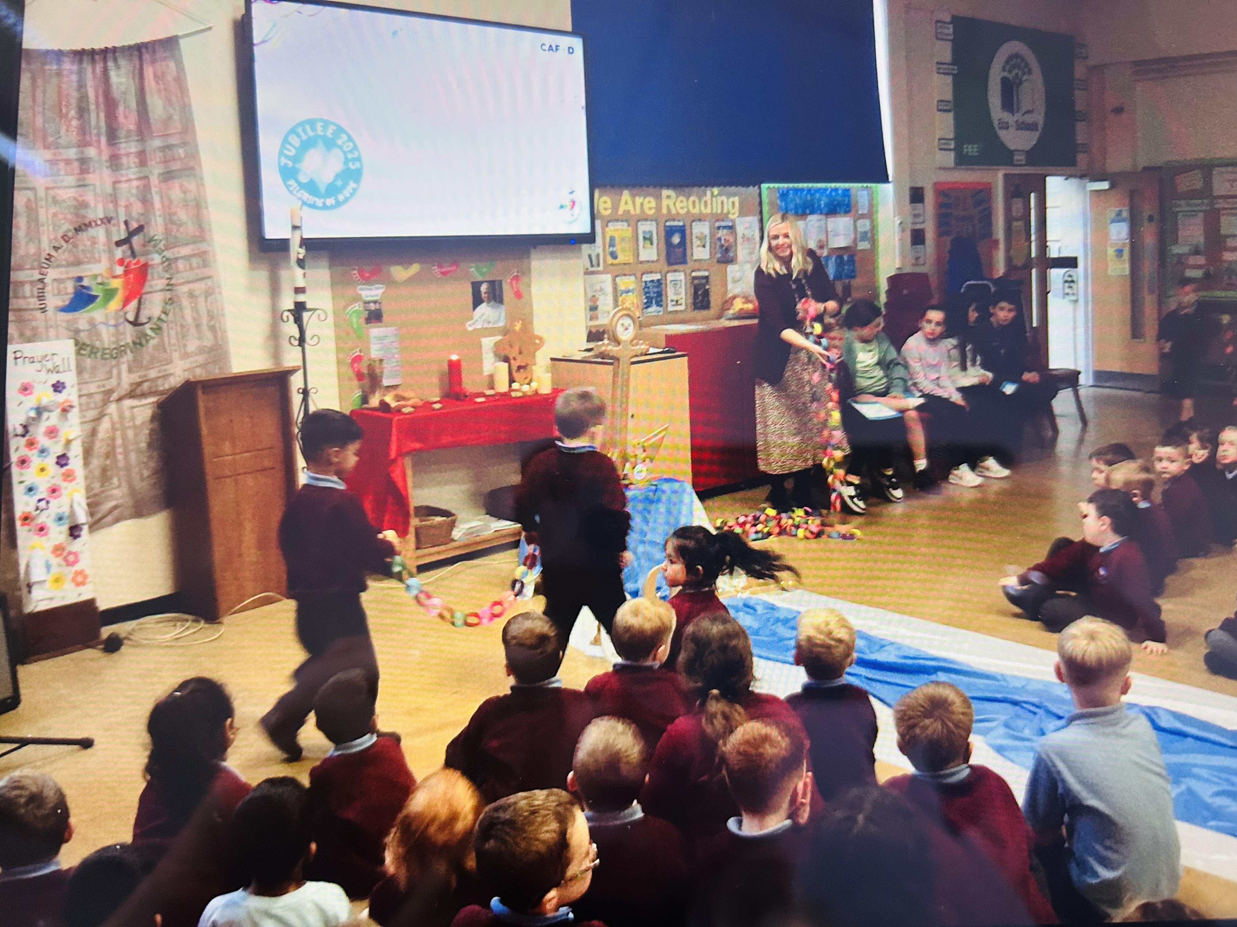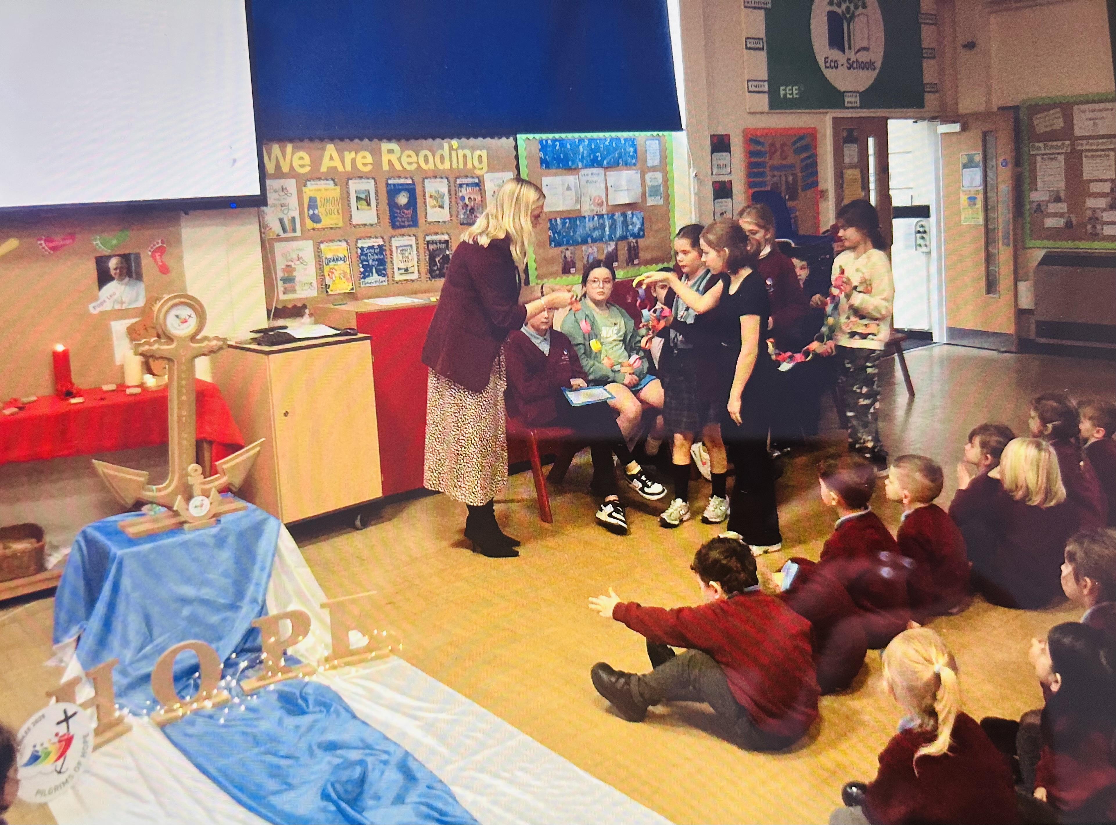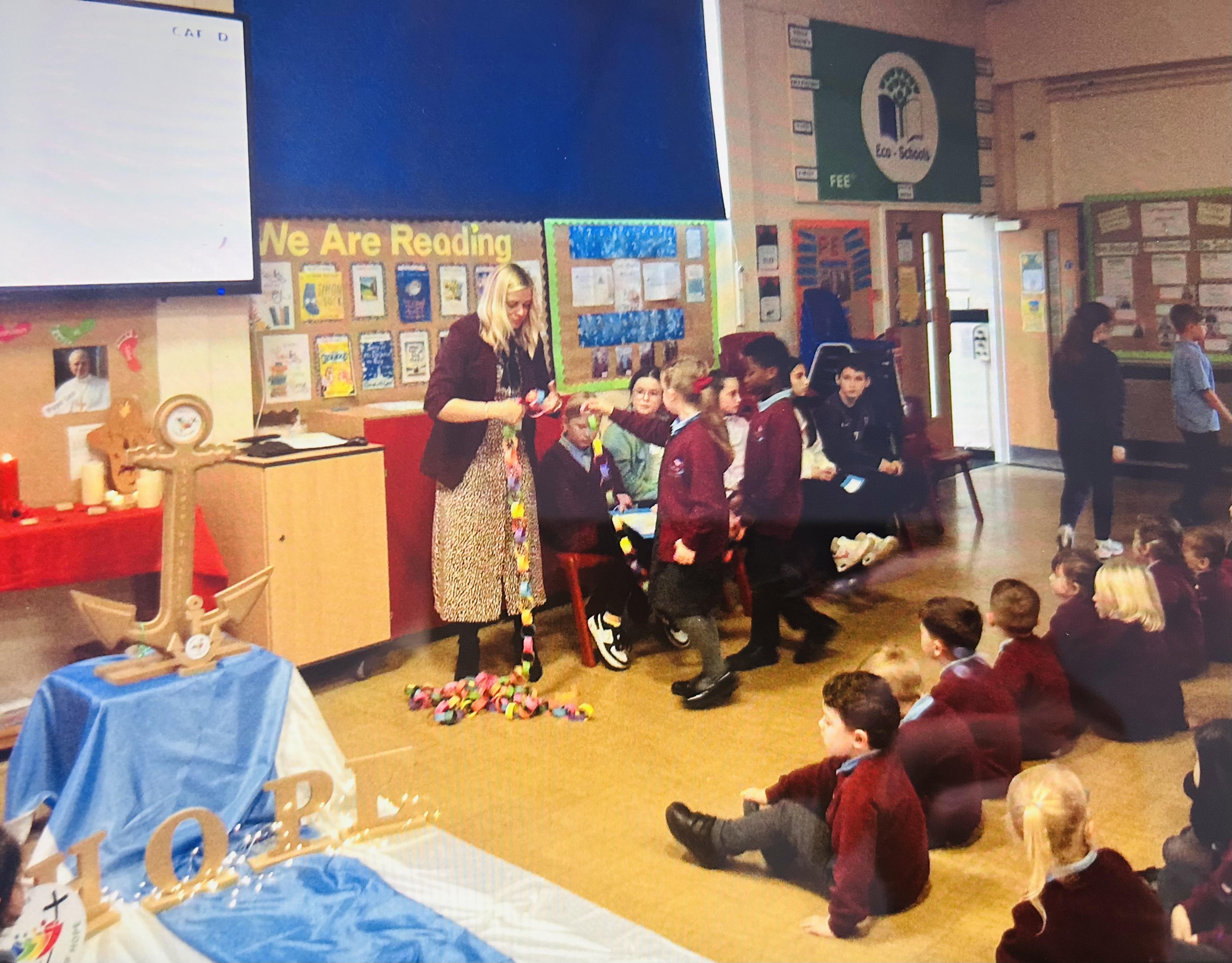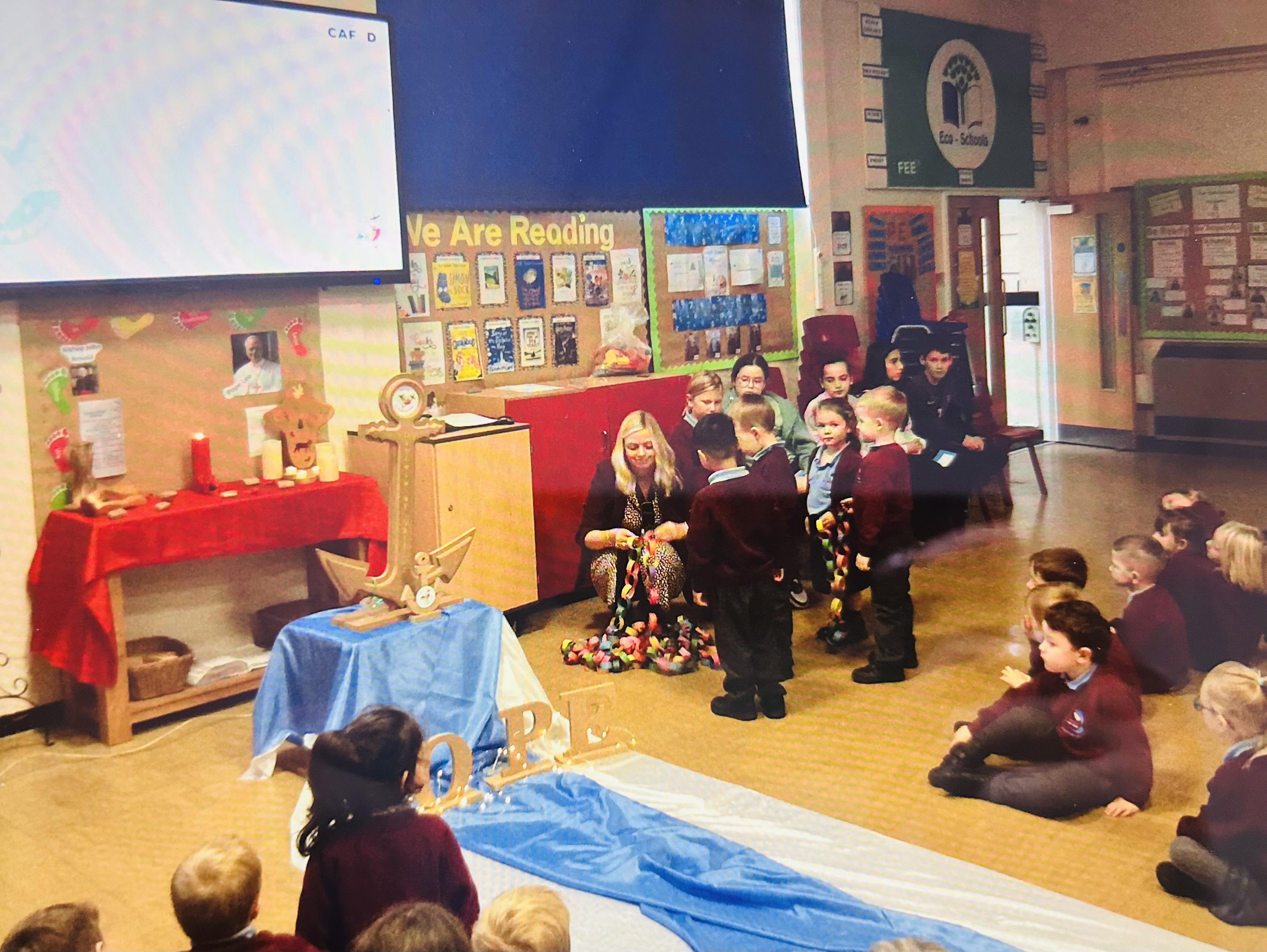 On Tuesday 4th November we held a whole school celebration of the Word. Classes had all made anchor chains, writing on how they can be pilgrims of hope. During the Celebration of the Word, we joined our class anchor chains together to make a large school anchor chain. All pupils also walked over the 'water' and touched the anchor stating "I am a pilgrim of Hope".