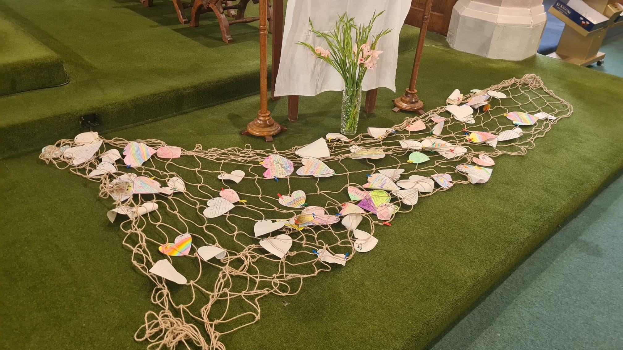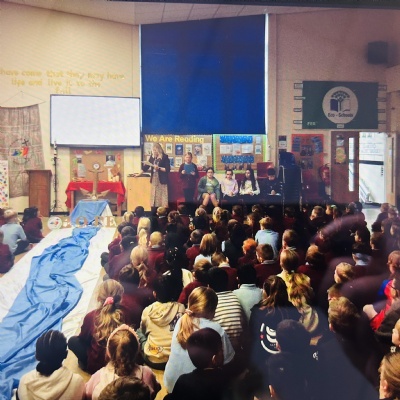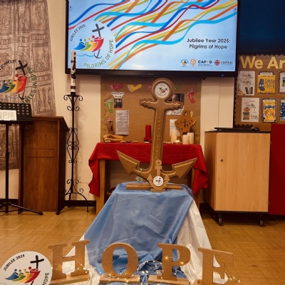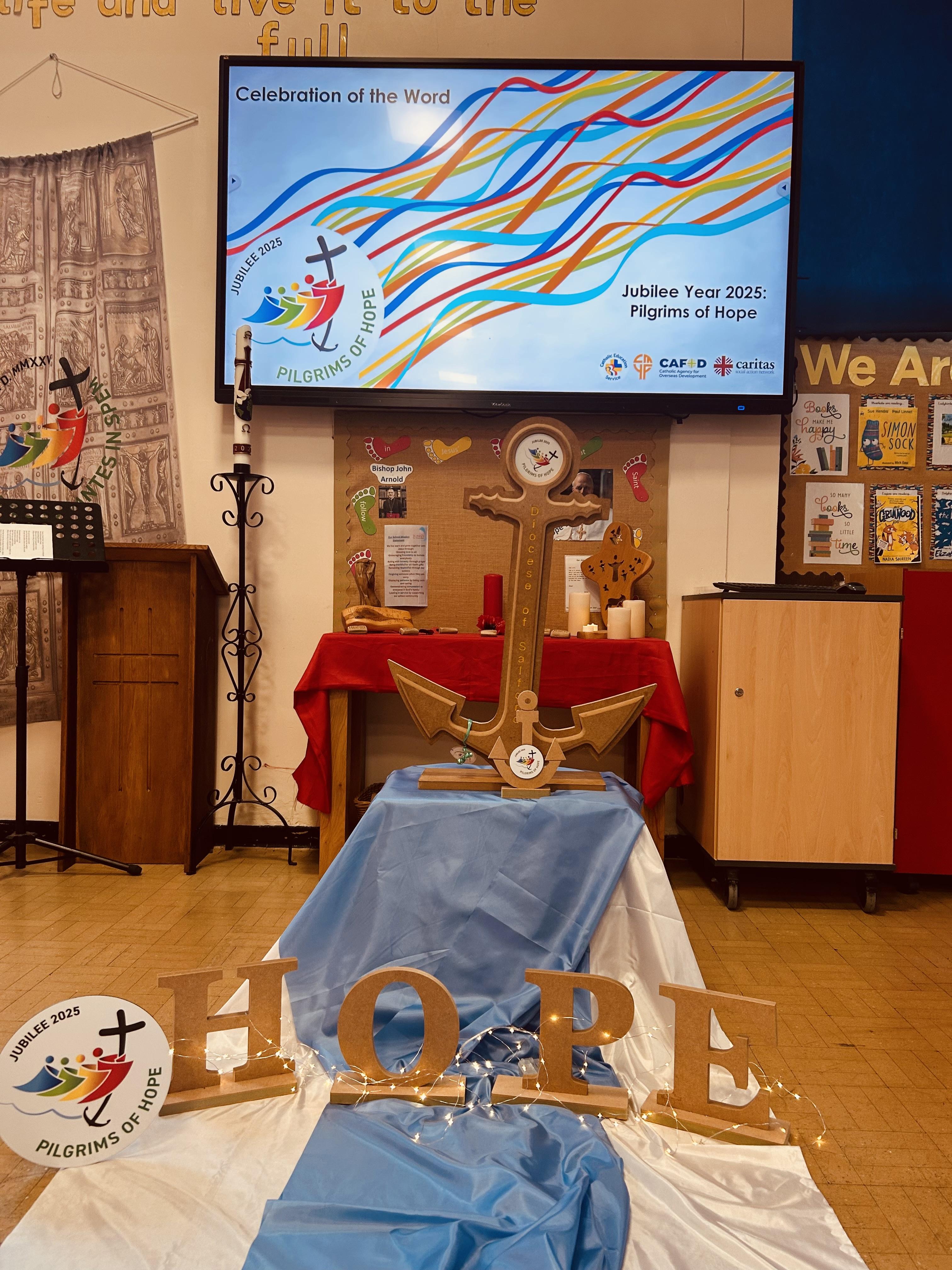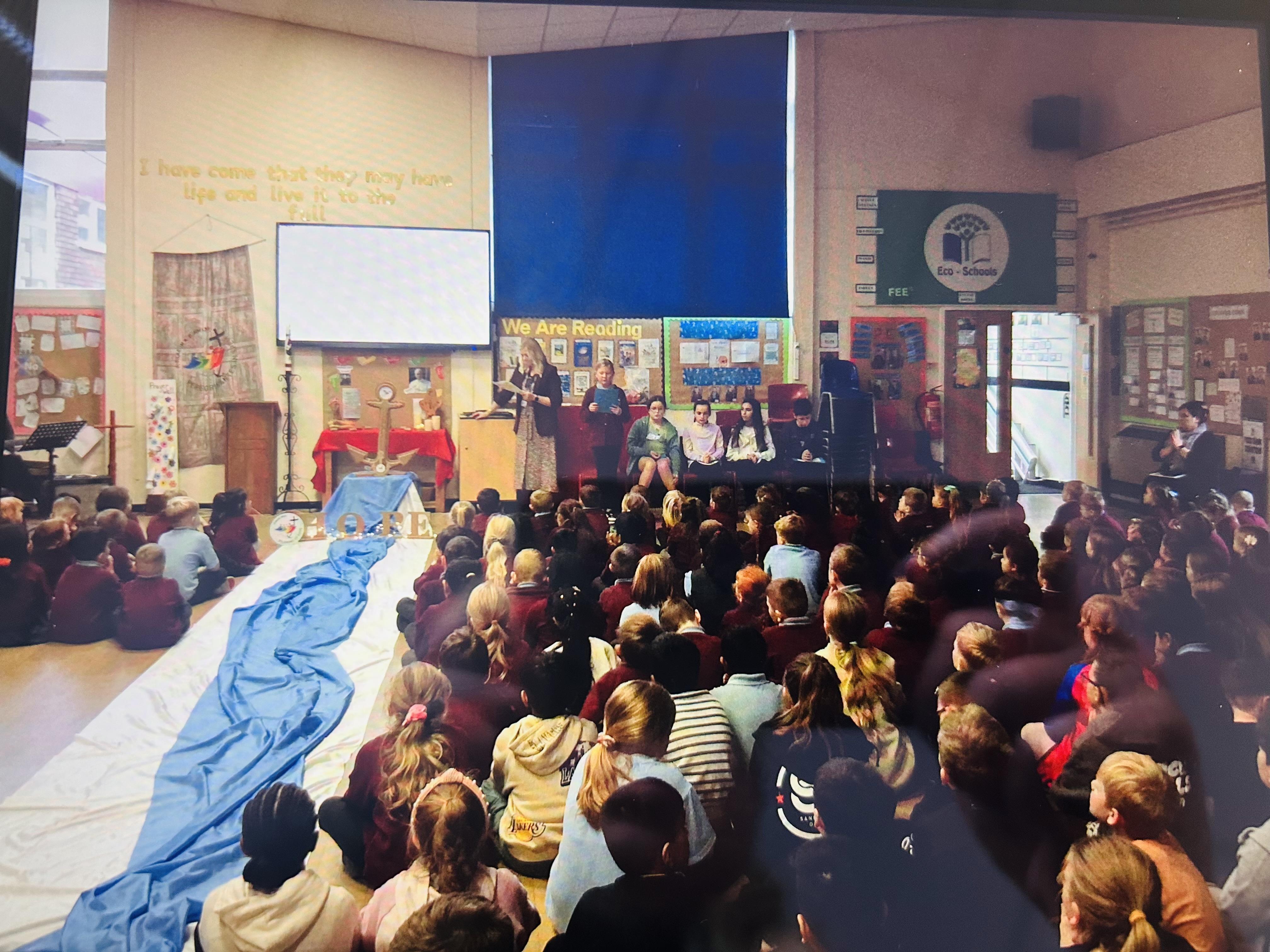 On Tuesday 4th November we held a whole school celebration of the Word. Classes had all made anchor chains, writing on how they can be pilgrims of hope. During the Celebration of the Word, we joined our class anchor chains together to make a large school anchor chain. All pupils also walked over the 'water' and touched the anchor stating "I am a pilgrim of Hope".