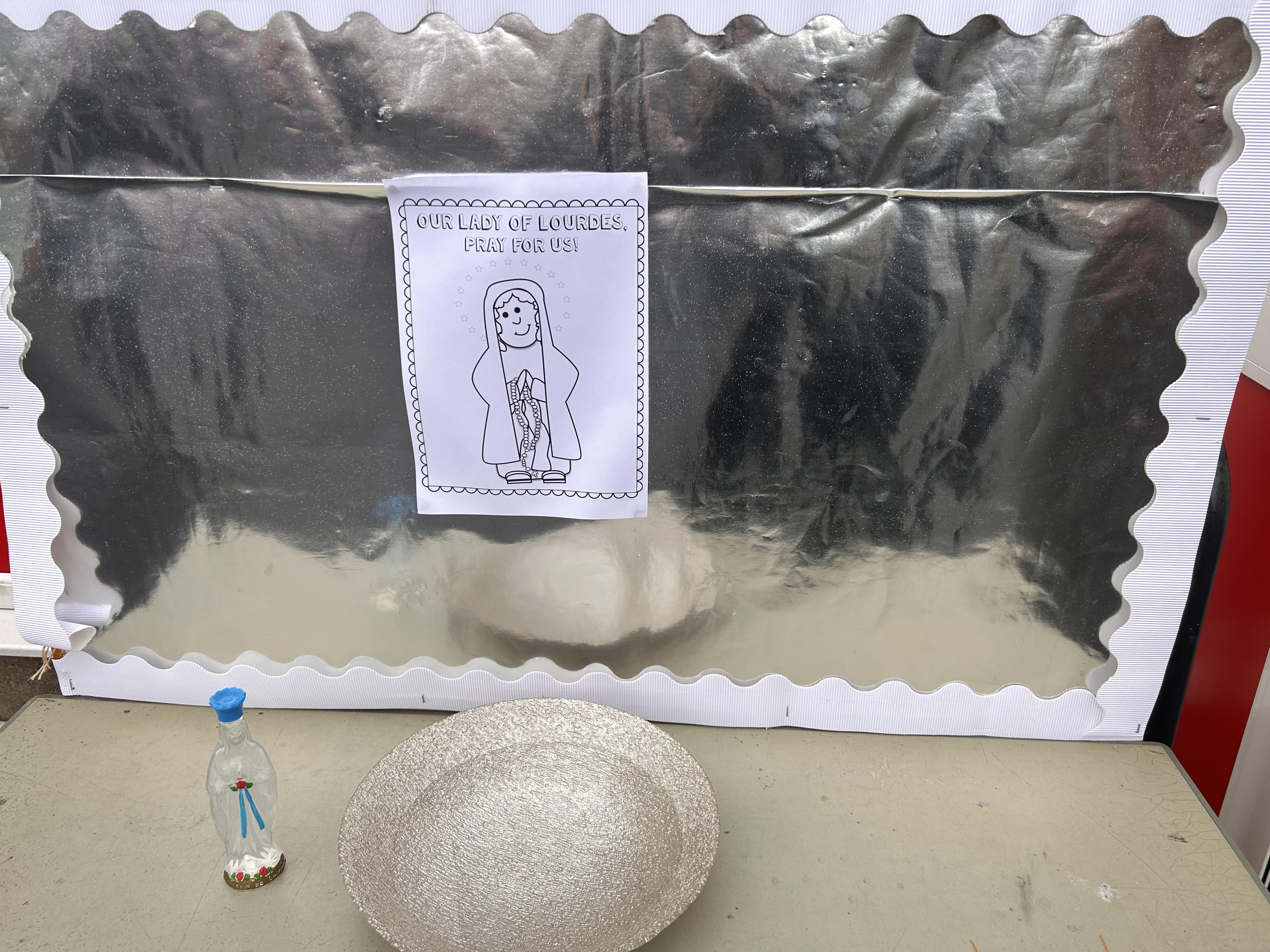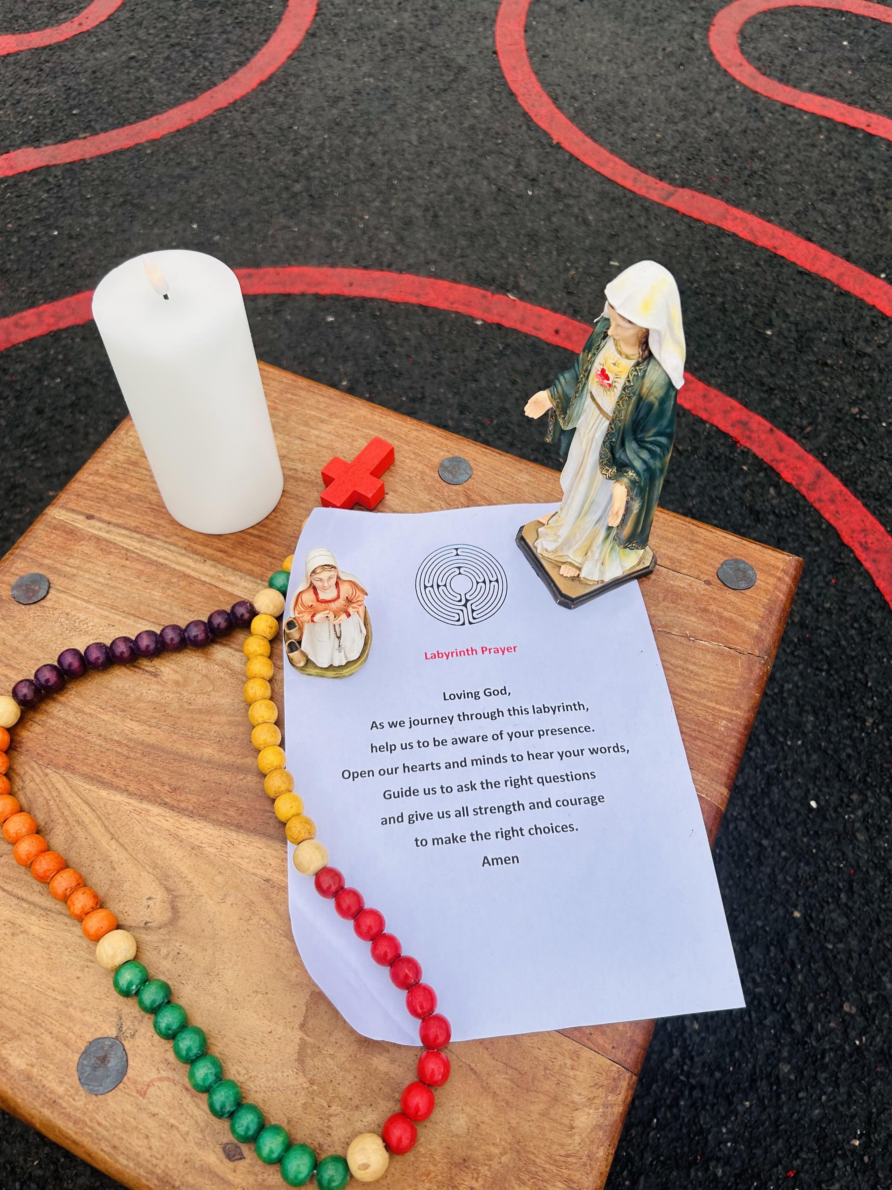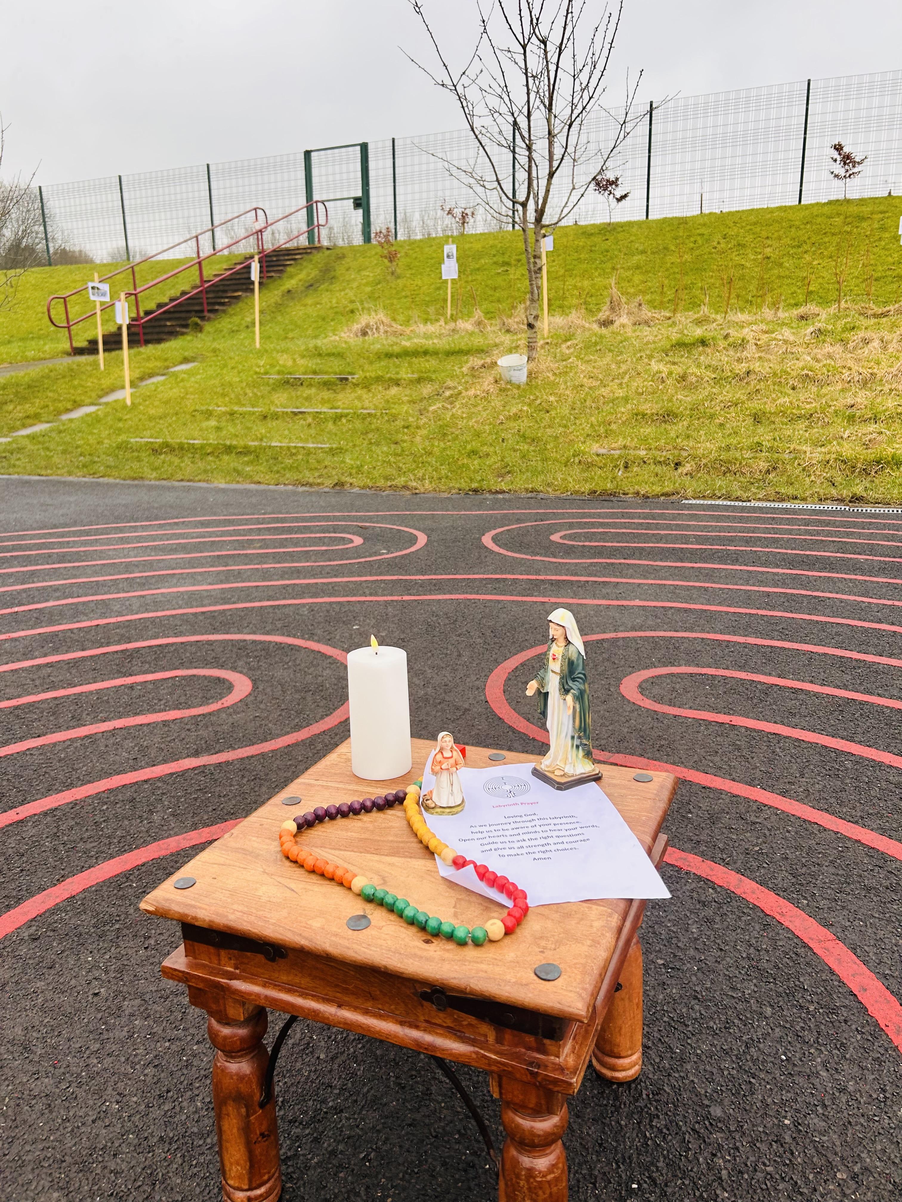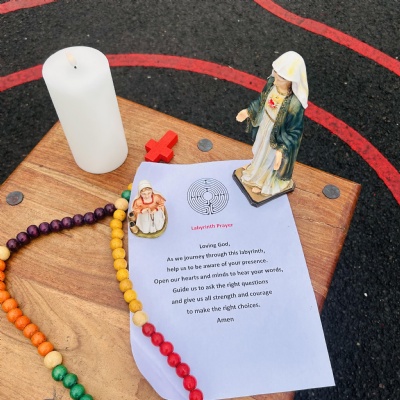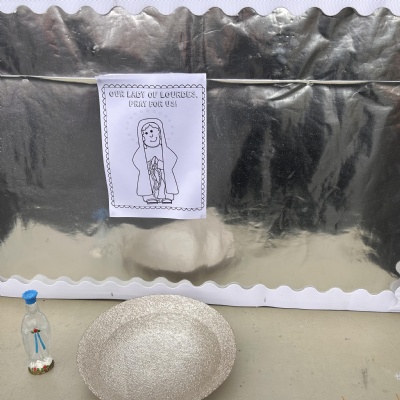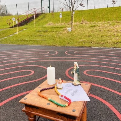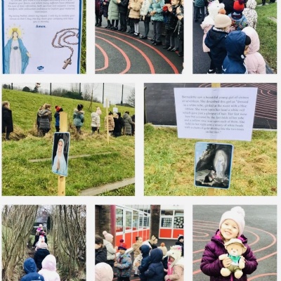 On Tuesday 11th February we held a mini pilgrimage around our school grounds to celebrate the feast of Our Lady of Lourdes. Pupils blessed themselves with Holy water then made their way to the labyrinth on the playground and walked the sensory path taking in the images and prayers along the way.