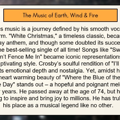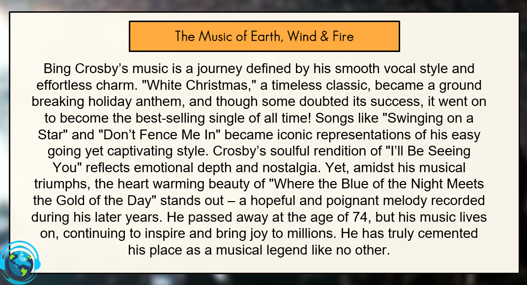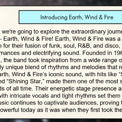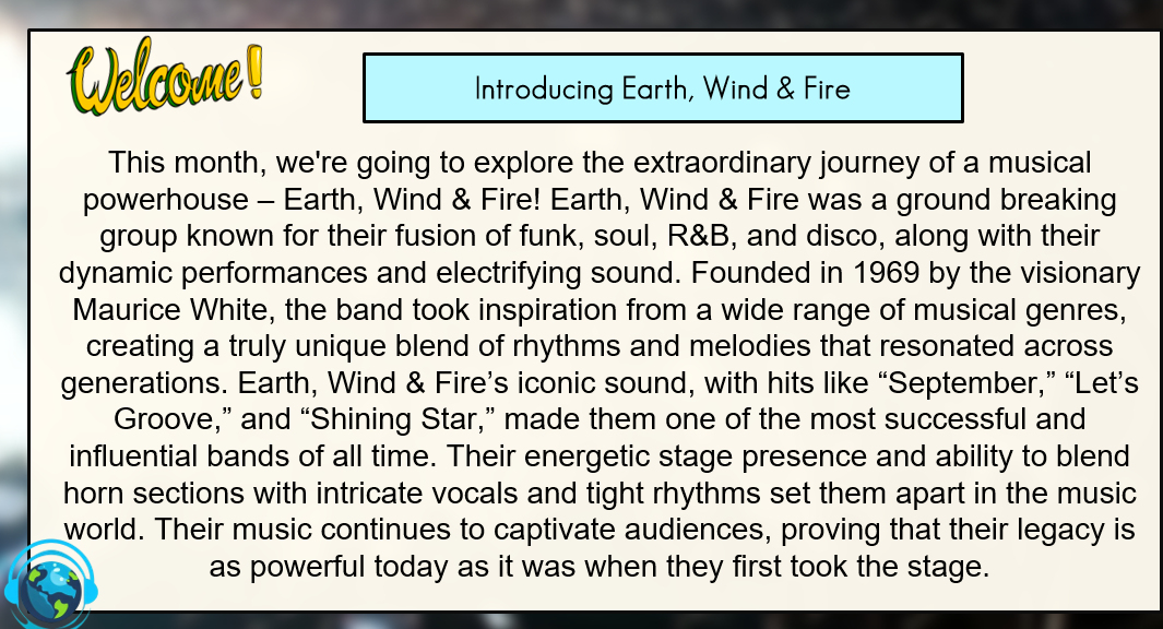 This month, our musicians are the band 'Earth, Wind and Fire!'