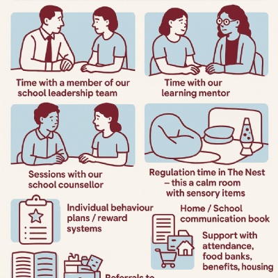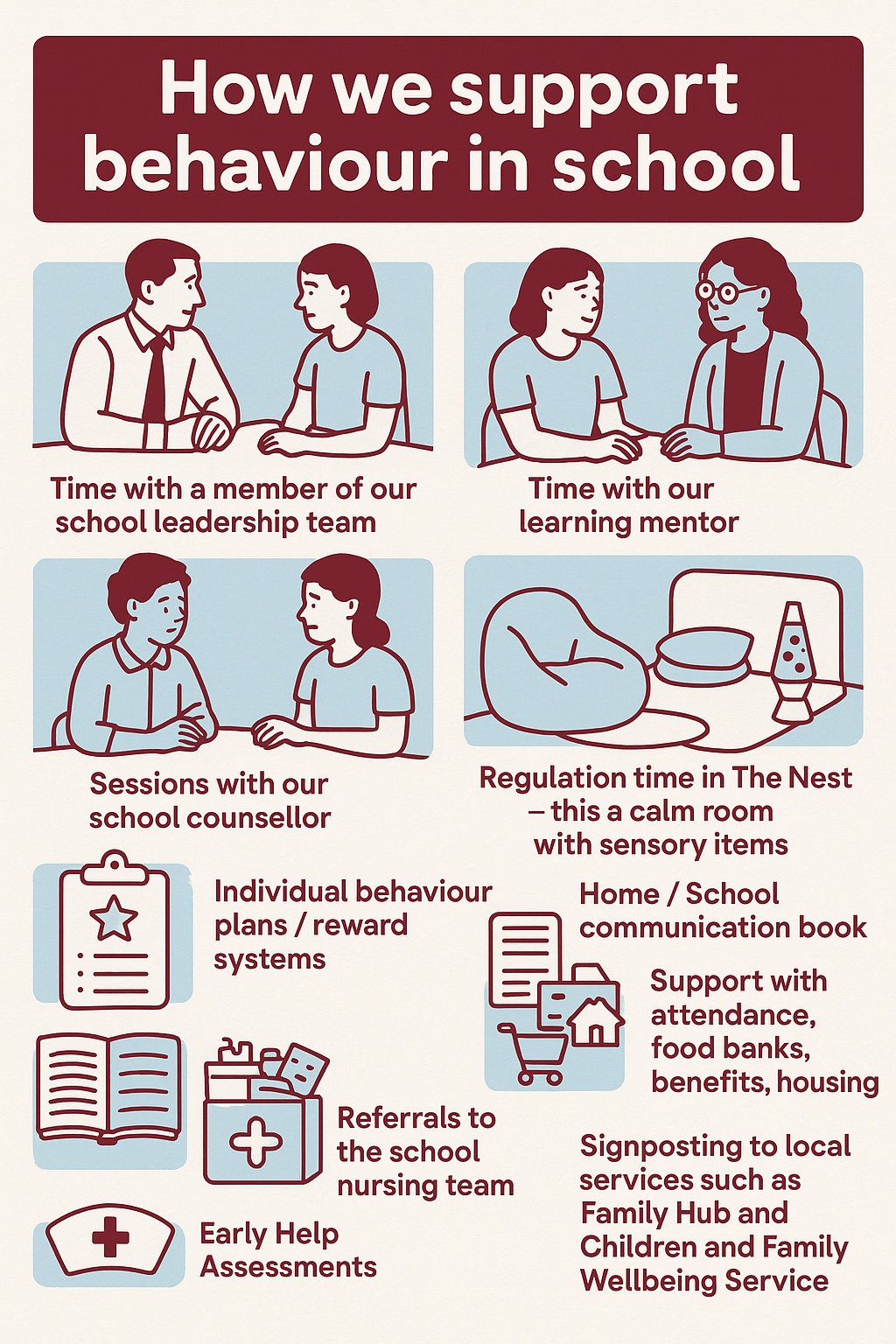 We have our learning mentor, Tina Salmon, who works with us on Mondays and Tuesdays. She can support families with a wide range of issues such as routines, behaviour, benefits, housing, food banks, hygiene, medical needs. She can be reached by calling school.